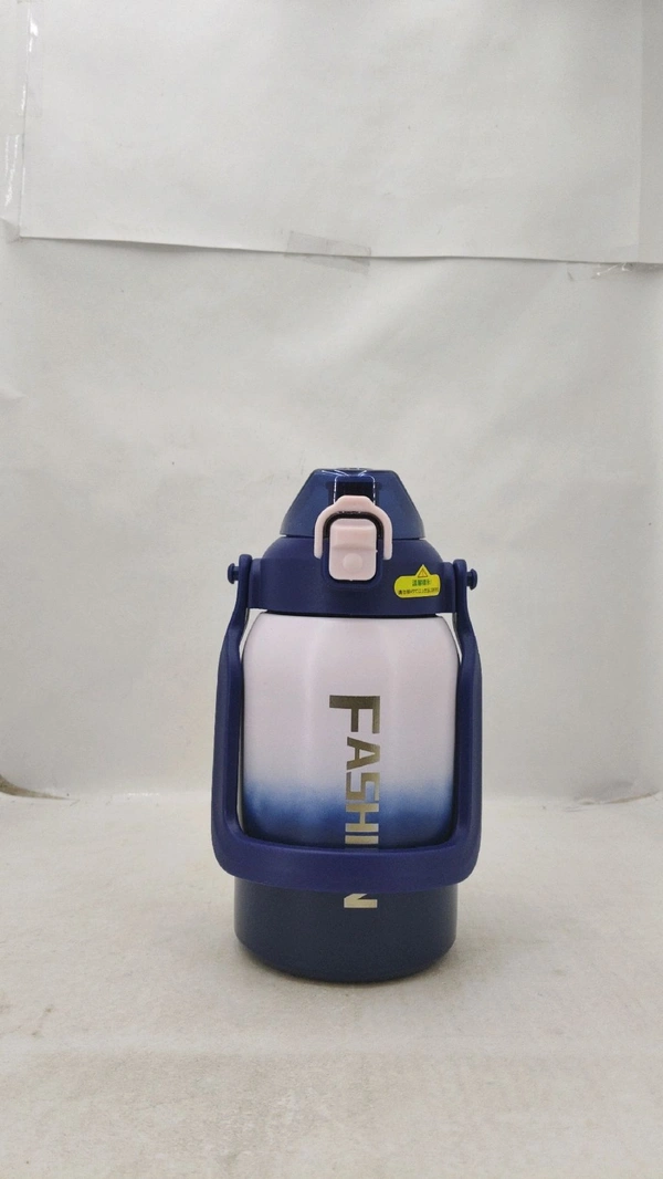 a Fashion branded water bottle featuring a blue and white gradient design, a carrying handle, and a locking lid.