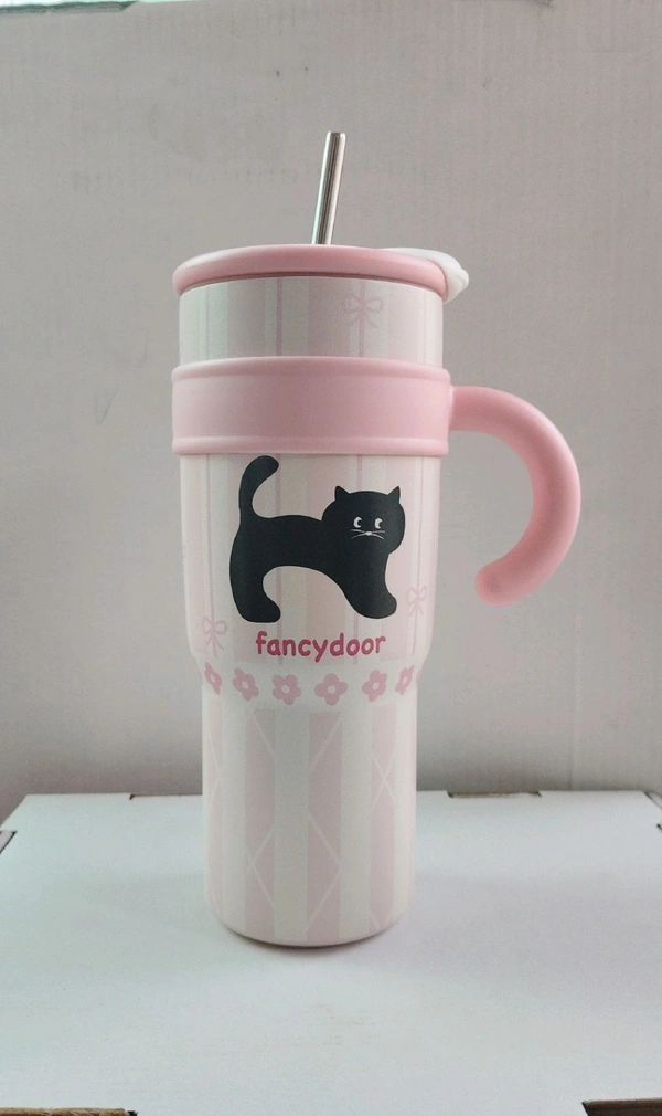 a pink, vacuum-insulated stainless steel tumbler featuring a handle, lid, straw, and a black cat graphic.