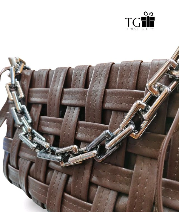 DARK BROWN PU LEATHER SLING BAG WITH A WOVEN MAT DESIGN AND A METAL CHAIN ACCENT