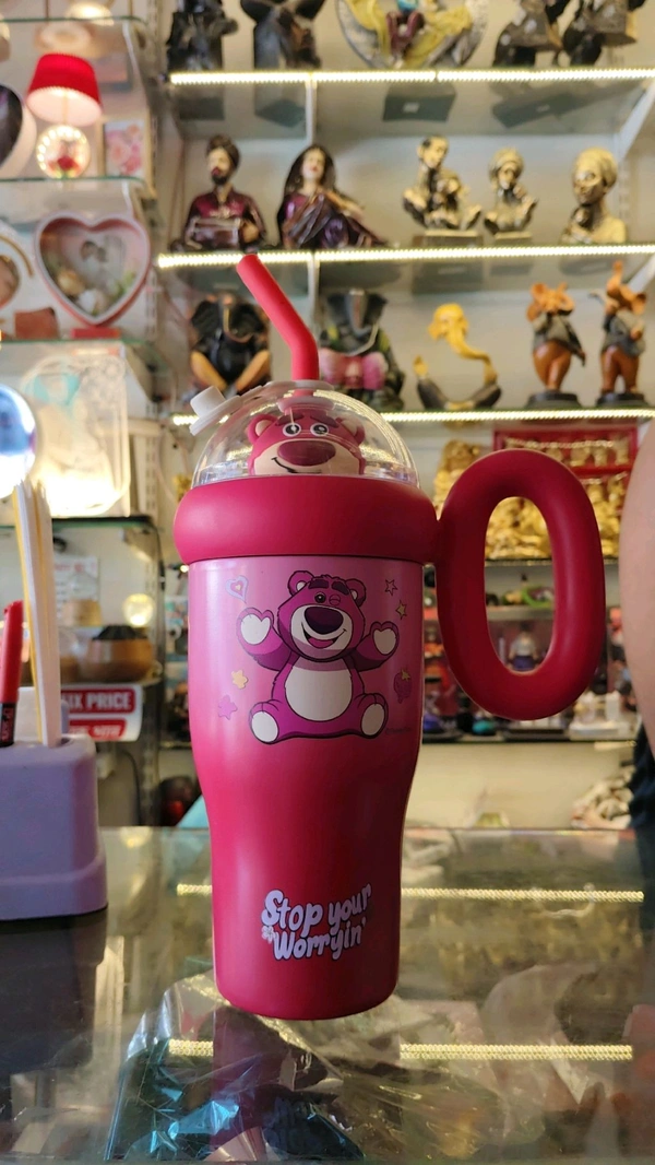 pink tumbler is a Disney Lotso character-themed stainless steel insulated flask featuring a 3D lid, straw, and carry handle.